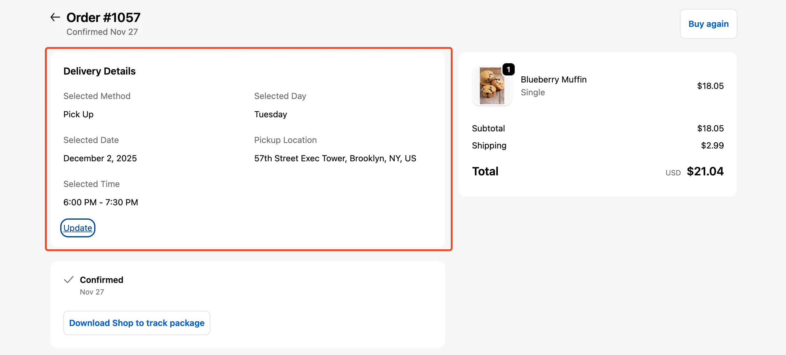 Bird lets customers return to the thank-you page or order status page and change their delivery or pickup slot themselves. They see their chosen method, date and time right after checkout, which: