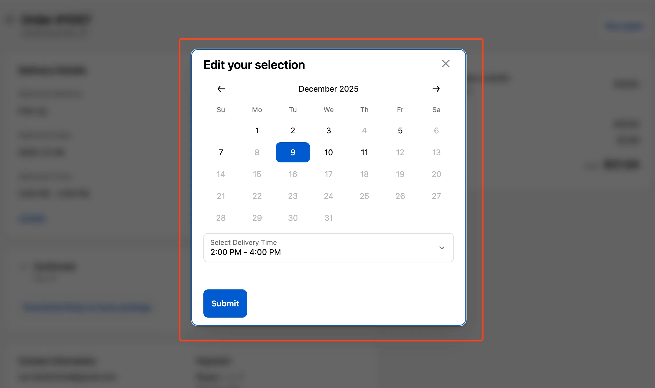 - Order limits and blockout dates remove unavailable days from the calendar, so customers can’t reschedule into them.